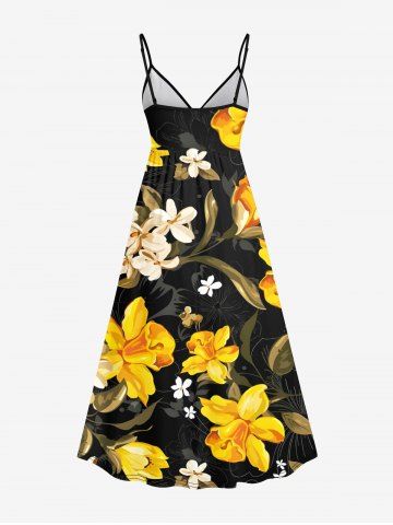 Plus Size Flowers Leaf Print Surplice Hawaii Cami Dress - Black - L