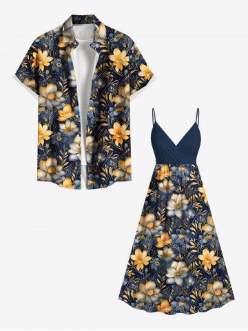 Plus Size Flowers Leaf Print Surplice Hawaii Cami Dress - Deep Blue - 4x