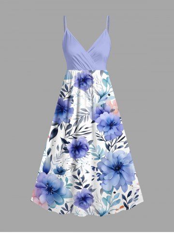 Plus Size Flowers Leaf Print Surplice Hawaii Cami Dress - Light Purple - 1x