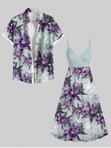 Plus Size Flowers Leaf Print Surplice Hawaii Cami Dress - Purple - S
