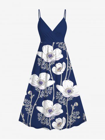 Plus Size Flowers Leaf Print Surplice Hawaii Cami Dress - Navy Blue - Xxs