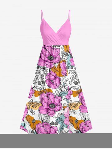 Plus Size Flowers Leaf Print Surplice Hawaii Cami Dress - Hot Pink - Xs
