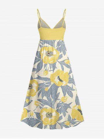 Plus Size Flowers Leaf Print Surplice Hawaii Cami Dress - Yellow - L