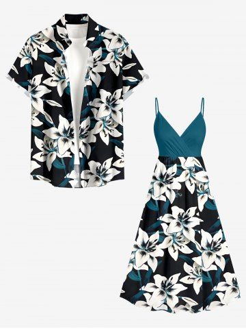 Plus Size Flowers Leaf Print Surplice Hawaii Cami Dress - Peacock Blue - Xs
