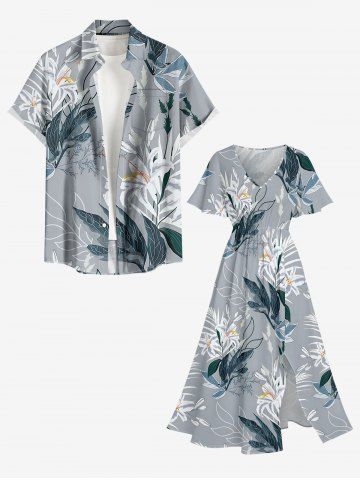 Plus Size Flowers Leaf Print Surplice Hawaii Midi Dress - Gray - Xs