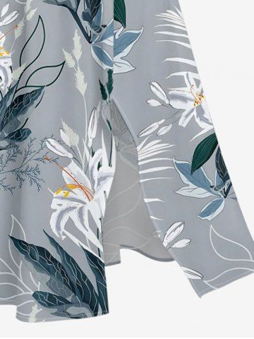 Plus Size Flowers Leaf Print Surplice Hawaii Midi Dress - Gray - 5x