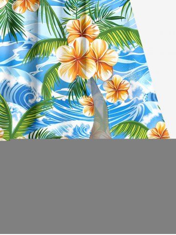 Plus Size Flowers Leaf Sea Waves Print Split Hawaii Midi Dress - Sky Blue - Xxs