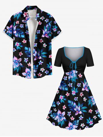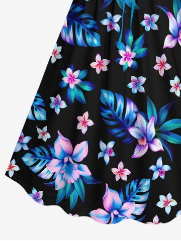 Plus Size Flowers Leaf Tropical Print Cinched Hawaii Dress - Black - 2x