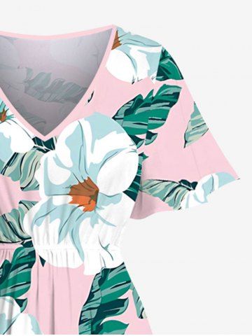Plus Size Flowers Leaf Tropical Print Split Hawaii Midi Dress - Light Pink - M