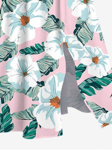 Plus Size Flowers Leaf Tropical Print Split Hawaii Midi Dress - Light Pink - L