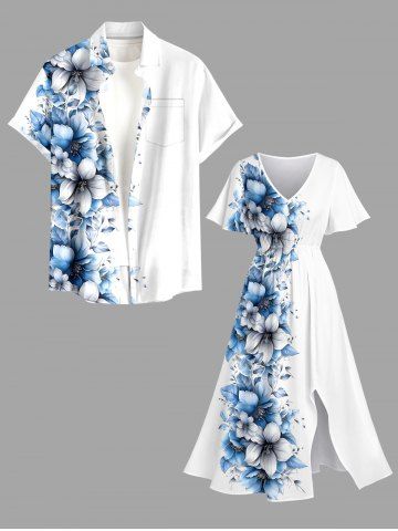 Plus Size Flowers Leaf Tropical Print Split Hawaii Midi Dress - White - M