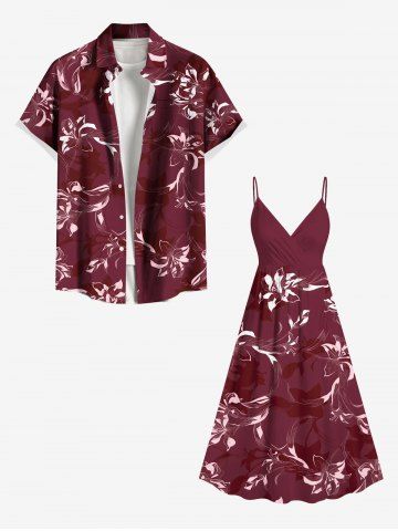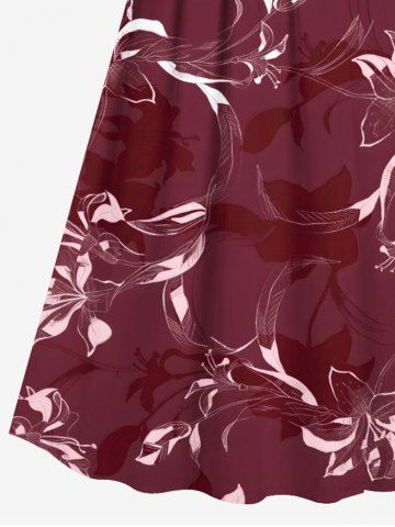 Plus Size Flowers Leaf Tropical Print Surplice Hawaii Cami Dress - Red - 4x