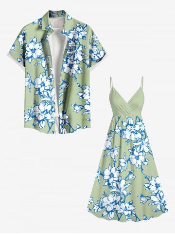 Plus Size Flowers Leaf Tropical Print Surplice Hawaii Cami Dress - Green - 3x
