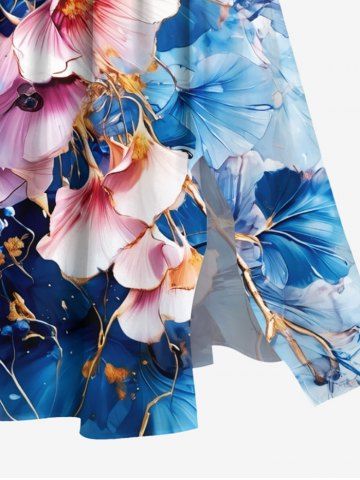 Plus Size Flowers Leaf Watercolor Print Split Hawaii Midi Dress - Blue - L