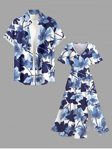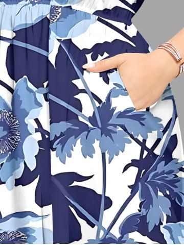 Plus Size Flowers Leaf Watercolor Print Split Hawaii Midi Dress - Blue - Xs