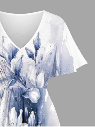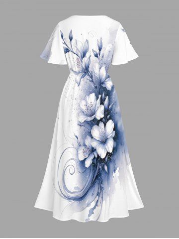 Plus Size Flowers Paint Splatter Print Split Hawaii Midi Dress - White - S
