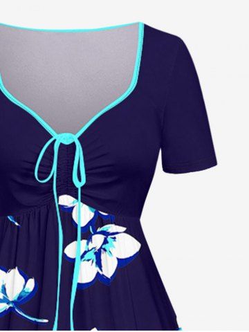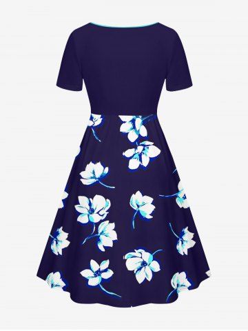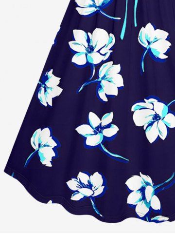 Plus Size Flowers Print Cinched Hawaii Dress - Navy Blue - 6x