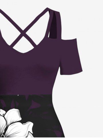 Plus Size Flowers Print Cold Shoulder Crisscross Hawaii Maxi Dress - Black - S