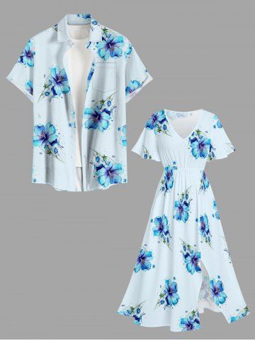 Plus Size Flowers Print Split Hawaii Midi Dress - Light Blue - 3x