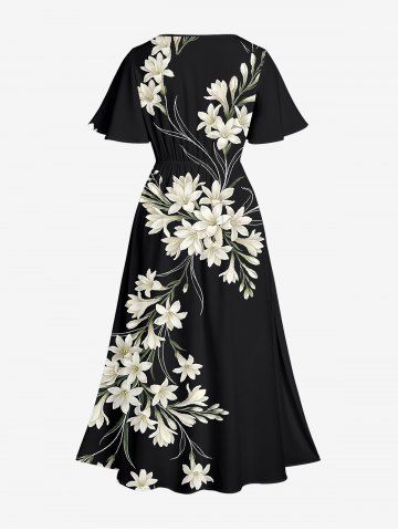 Plus Size Flowers Print Split Hawaii Midi Dress - Black - Xs