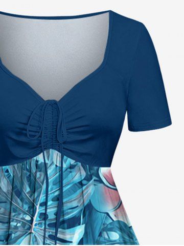 Plus Size Flowers Tropical Leaf Print Cinched Hawaii Dress - Deep Blue - 3x