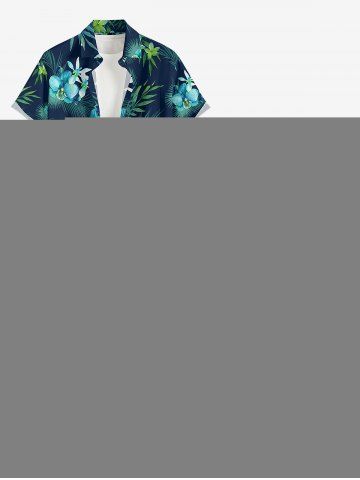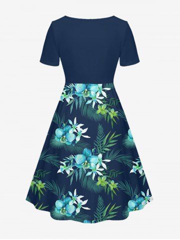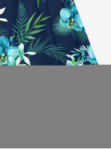 Plus Size Flowers Tropical Leaf Print Cinched Hawaii Dress - Deep Blue - Xxs