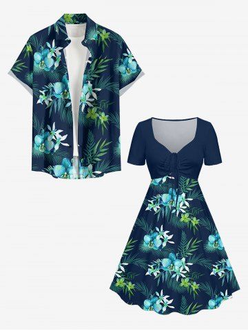 Plus Size Flowers Tropical Leaf Print Cinched Hawaii Dress - Deep Blue - M
