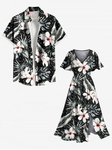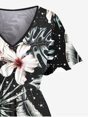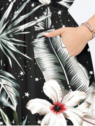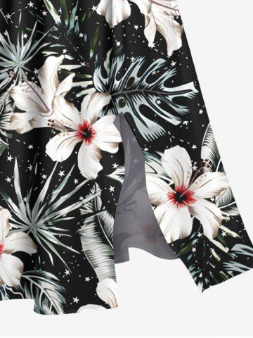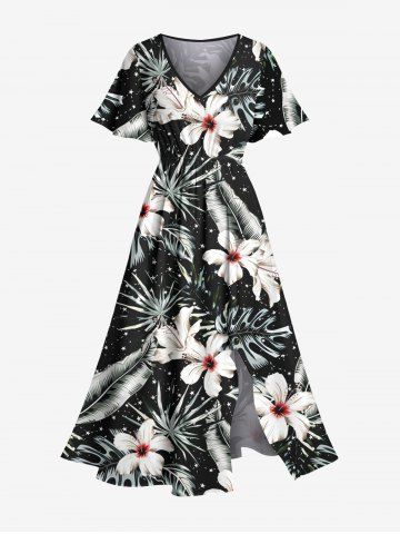 Plus Size Flowers Tropical Leaf Print Split Hawaii Midi Dress - Black - 2x
