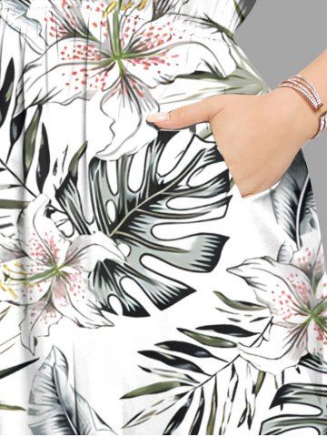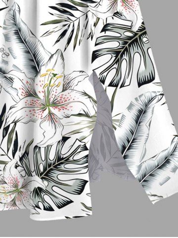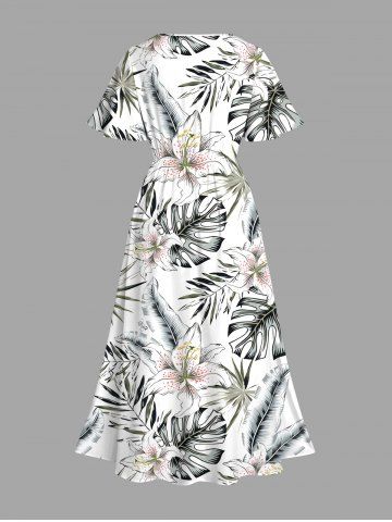 Plus Size Flowers Tropical Leaf Print Split Hawaii Midi Dress - White - L