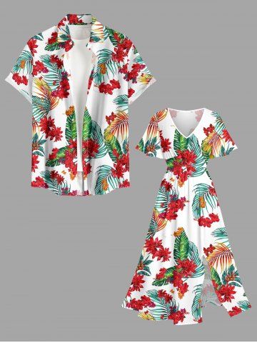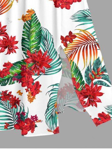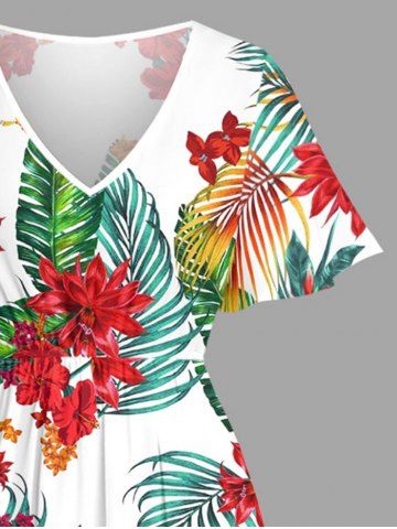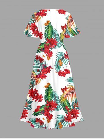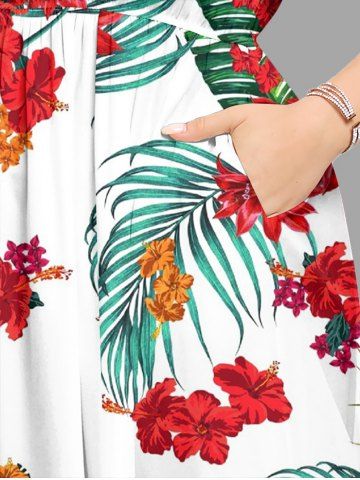 Plus Size Flowers Tropical Leaf Print Split Hawaii Midi Dress - White - M