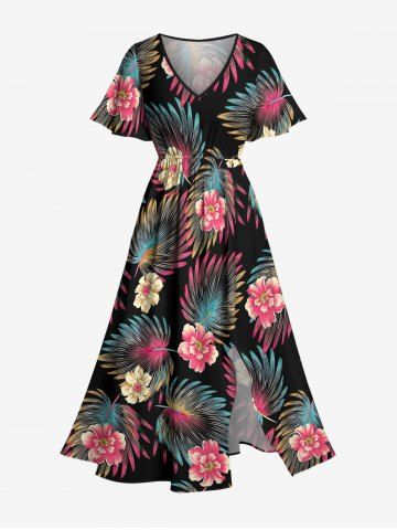 Plus Size Flowers Tropical Leaf Print Split Hawaii Midi Dress - Black - M