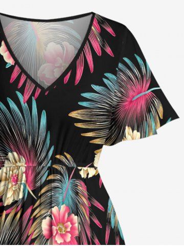 Plus Size Flowers Tropical Leaf Print Split Hawaii Midi Dress - Black - L