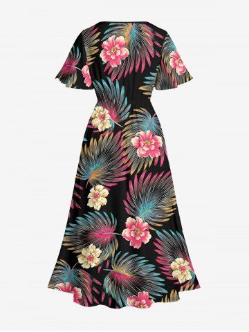 Plus Size Flowers Tropical Leaf Print Split Hawaii Midi Dress - Black - 5x