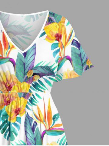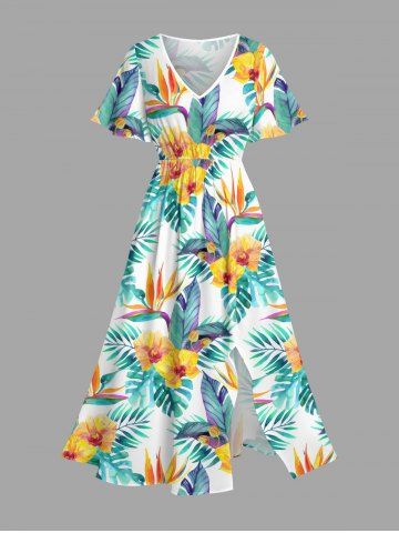 Plus Size Flowers Tropical Leaf Print Split Hawaii Midi Dress - Green - 5x