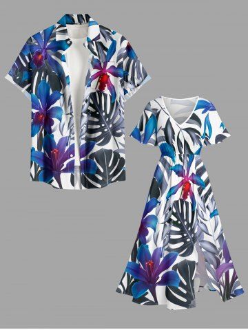 Plus Size Flowers Tropical Leaf Print Split Hawaii Midi Dress - Blue - 5x