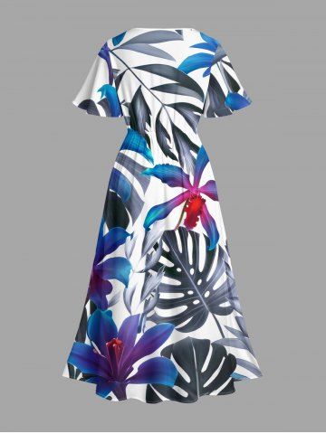 Plus Size Flowers Tropical Leaf Print Split Hawaii Midi Dress - Blue - 6x