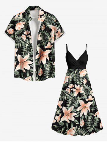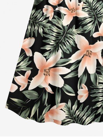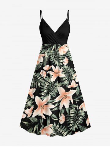 Plus Size Flowers Tropical Leaf Print Surplice Hawaii Cami Dress - Black - S