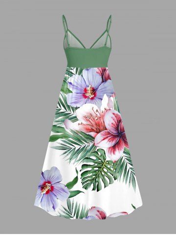 Plus Size Flowers Tropical Leaf Print Surplice Hawaii Cami Dress - Light Green - 2x