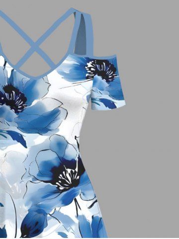 Plus Size Flowers Watercolor Print Cold Shoulder Cold Shoulder Crisscross Hawaii Maxi Dress - Blue - Xs