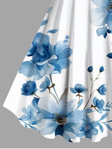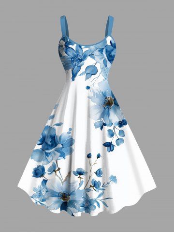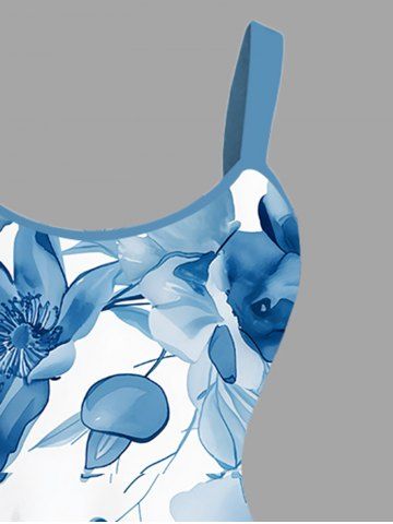 Plus Size Flowers Watercolor Print Hawaii Tank Dress - Blue - S