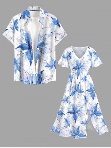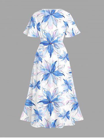 Plus Size Flowers Watercolor Print Split Hawaii Midi Dress - Light Blue - L