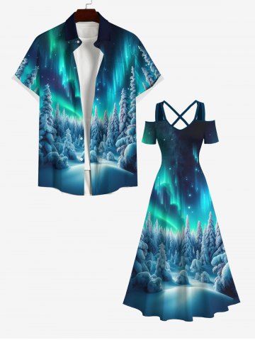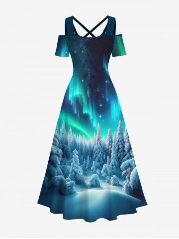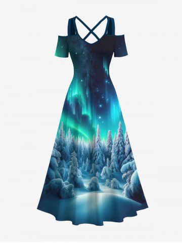Graphic Dresses > Plus Size Forest Snow Galaxy Light Beam Glitter 3D Print Cold Shoulder Crisscross Maxi Dress