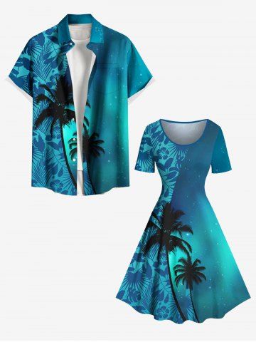 Graphic Dresses > Plus Size Galaxy Ombre Coconut Tree Hibiscus Flowers Leaf Print Hawaii Vintage Dress