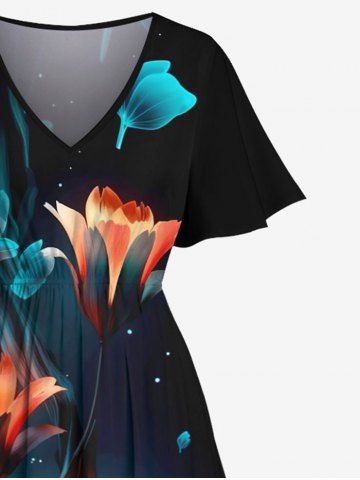 Plus Size Glitter Flower Branch Ombre Galaxy Print Hawaii Split Pocket A Line Midi Dress - Black - M