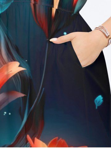 Plus Size Glitter Flower Branch Ombre Galaxy Print Hawaii Split Pocket A Line Midi Dress - Black - 4x