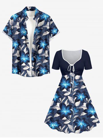 Plus Size Glitter Flower Leaf Print Hawaii Cinched A Line Dress - Blue - 2x