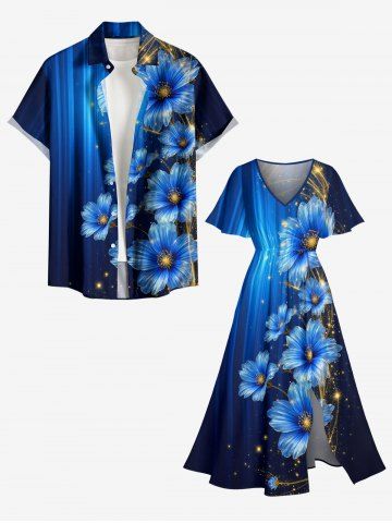 Plus Size Glitter Flower Ombre Light Beam Print Hawaii Split Pocket A Line Midi Dress - Deep Blue - Xs