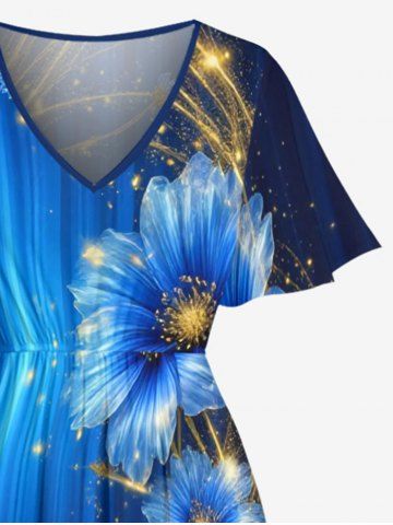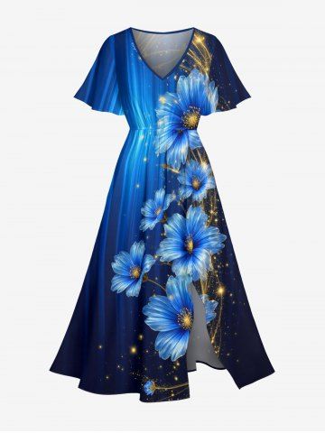 Plus Size Glitter Flower Ombre Light Beam Print Hawaii Split Pocket A Line Midi Dress - Deep Blue - S