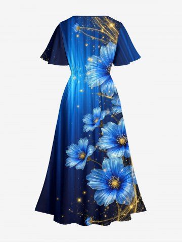 Plus Size Glitter Flower Ombre Light Beam Print Hawaii Split Pocket A Line Midi Dress - Deep Blue - 5x
