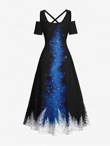 Graphic Dresses > Plus Size Glitter Galaxy Grass Print Hawaii Crisscross A Line Maxi Dress